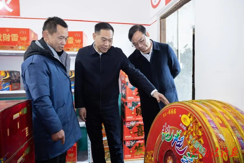 在楊市鎮(zhèn)長軍煙花爆竹店,市委書記段曉賽檢查煙花爆竹安全。