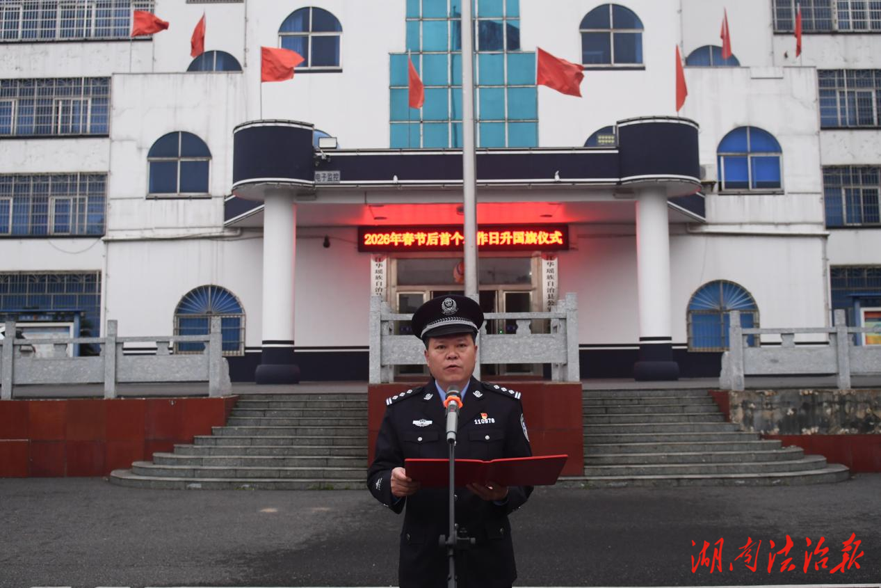 湖南法治報(bào)訊(通訊員 吳思)蛇銜瑞氣留勝跡,馬踏祥云伴春來。2月24日,江華瑤族自治縣公安局隆重舉行迎新春升國旗儀式,縣人民政府副縣長提名人選、縣公安局局長蔣劍彬出席儀式并致辭,儀式由局黨委副書記、副局長張擁軍主持,全體局黨委班子成員、民輔警代表100余人參加。